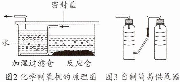 。【模仿改造】化学制氧机(原理图见图2)利用过碳酸钠白色固体、二氧化锰黑色粉末产生氧气。过碳酸钠($2Na_{2}CO_{3}\cdot 3H_{2}O_{2}$)加水溶解会分解生成碳酸钠和过氧化氢。用该制氧机制氧时,在反应仓中加入适量水,再先后加入过碳酸钠和二氧化锰,反应仓内有黑色粉末翻腾,变得浑浊,仓壁变得温热,过滤仓底部导气管口有气泡冒出。