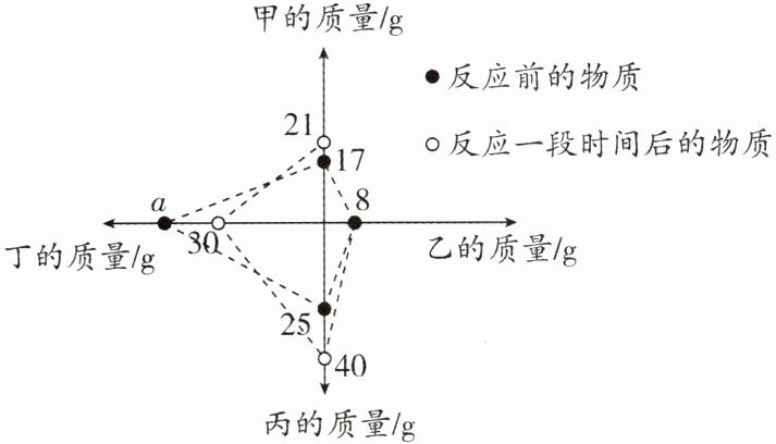 D 解析:反应前后乙的质量不变,则乙可能是该反应的催化剂,也可能是没有参与反应的杂质,A 错误;该反应是丁在一定条件下生成甲和丙,符合“一变多”的特点,属于分解反应,B 错误;反应中甲、丙的质量变化量之比为 $(21g - 17g):(40g - 25g) = 4:15$,由于化学计量数未知,则不能确定甲、丙的相对分子质量之比,C 错误;根据质量守恒定律可知 a 为 49,反应中丁、甲、丙的质量变化量之比为 $(49g - 30g):(21g - 17g):(40g - 25g) = 19:4:15$,若继续反应至丙为 55g,即又生成 15g 丙,则同时生成 4g 甲,此时甲的质量为 $21g + 4g = 25g$,丁的质量为 $30g - 19g = 11g$,所以若继续反应至丙为 55g,则此时甲和丁的质量比为 $25:11$,D 正确。