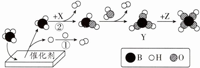 C 解析:由图可知,含硼的微观粒子有 5 种,分别为 $BH_{4}$、$BH_{3}$、$BH_{3}O$、$B(OH)_{3}$、$B(OH)_{4}$,A 错误;过程①的微观实质是 2 个氢原子结合成 1 个氢分子,B 错误;过程②为 $BH_{3}$ 与 X 反应生成 $H_{2}$ 与 $BH_{2}OH$,过程②中各微粒的数目比为 $1:1:1:1$,根据质量守恒定律,化学反应前后原子的种类与数目均不变,故 X 中含有 2 个 H、1 个 O,即 X 为 $H_{2}O$,C 正确;由物质的转化可知,若 Y 与 Z 发生化合反应,是由 $B(OH)_{3}$ 转化为 $B(OH)_{4}$,由质量守恒定律,反应前后原子的种类及数目不变可知,则微粒 Z 为![img alt=7C],D 错误。