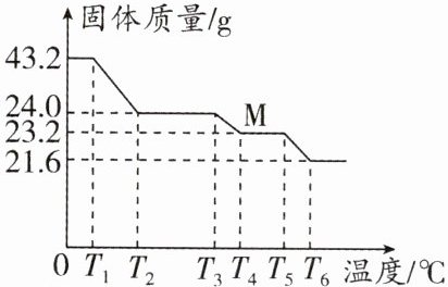 B 解析:根据 $FeC_{2}O_{4}$ 化学式可知,$FeC_{2}O_{4}$ 由亚铁离子和草酸根离子构成,A 错误;由图可知,生成 M 的质量为 23.2g,根据质量守恒定律,化学反应前后,元素的种类和质量不变,则 M 中铁元素的质量与草酸亚铁中铁元素的质量相同,则铁元素的质量为 $43.2g×\frac{56}{56 + 12×2 + 16×4}×100\% = 16.8g$,则 M 中氧元素的质量 = $23.2g - 16.8g = 6.4g$,设 M 的化学式为 $Fe_{a}O_{b}$,则 $56a:16b = 16.8g:6.4g$, $a:b = 3:4$,故 M 的化学式为 $Fe_{3}O_{4}$,B 正确;根据图示可知,$T_{5}^{\circ}C$ 时,固体 M 开始分解,C 错误;固体质量由 43.2g 变为 24.0g 时,若按 $FeC_{2}O_{4}\xlongequal{\triangle}FeCO_{3}+CO\uparrow$ 方式进行,设反应过程中生成 $FeCO_{3}$ 的质量为 x。