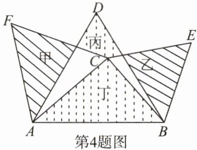 4. 如图,以 $ \triangle ABC $ 的每一条边为边作三个正三角形 $ \triangle ABD $,$ \triangle BCE $ 和 $ \triangle ACF $。已知这三个正三角形构成的图形中,甲、乙阴影部分的面积和等于丙、丁阴影部分的面积和,则 $ \angle FCE = ( ) $。