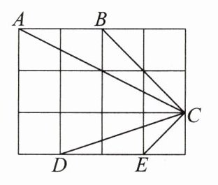 9. 如图,在 $ 4 × 3 $ 的正方形网格中,$ \triangle ABC $ 与 $ \triangle DEC $ 的顶点都在边长为 1 的小正方形的顶点上,求 $ \angle ACB + \angle DCE $ 的度数。