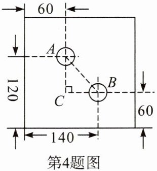 4. 如图是一个外轮廓为正方形的机器零件平面示意图,根据图中标出尺寸(单位:$ \text{mm} $)计算两圆孔中心 $ A $ 和 $ B $ 的距离为 。