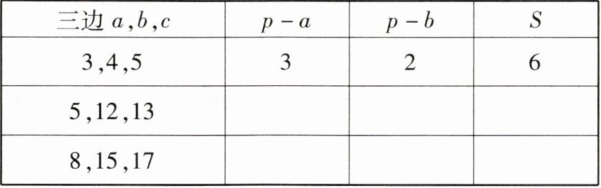 |三边 $ a $,$ b $,$ c $| $ p - a $| $ p - b $| $ S $|