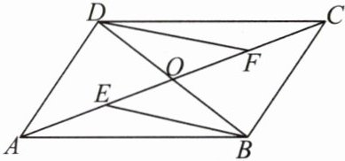 8. 如图,在$□ ABCD$中,$AC交BD于点O$,点$E$,点$F分别是OA$,$OC$的中点,请判断线段$BE$,$DF$的关系,并证明你的结论。