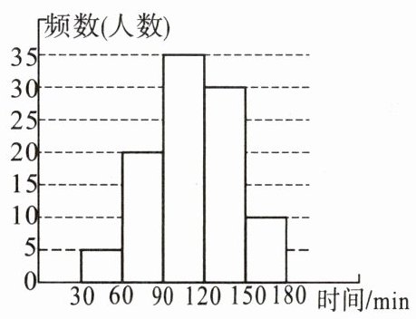 6. 为了了解学生参加家务劳动的情况,某中学随机抽取部分学生,统计他们双休日两天家务劳动的时间,将统计的劳动时间(单位:min)分成5组:$30\leqslant x<60$,$60\leqslant x<90$,$90\leqslant x<120$,$120\leqslant x<150$,$150\leqslant x<180$,绘制成频数直方图. 请根据图中提供的信息,解答下列问题: