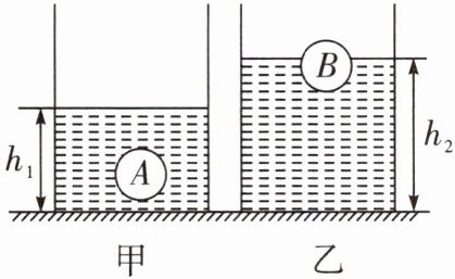8. 如图所示,两个相同的圆柱形容器放在水平桌面上,分别装有甲、乙两种不同的液体。将体积相同、密度不同的实心球A、B分别放入容器中静止时,A球悬浮,B球漂浮,$ h_1<h_2 $,且两种液体对容器底的压强相等,下列说法正确的是(