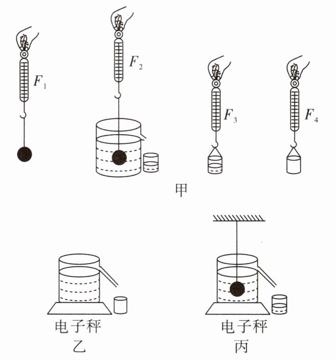 (填“能”或“不能”)验证。(5)他又进行了如下深入探究:将溢水杯中注满水放在电子秤上,如图乙所示,其示数为$ m_1 $,将铁球用细线悬挂轻轻放入水中浸没,待杯中水停止外溢时,如图丙所示,其示数为$ m_2 $,则$ m_1 $