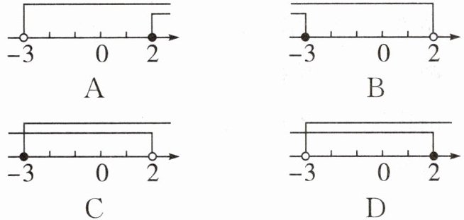 在数轴上表示为:以$-3$为端点的实心圆点向右画线,以$2$为端点的空心圆圈向左画线,两线重合部分为解集。