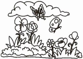 天空中飘着云朵,云朵下有几只蝴蝶在飞舞。地面上开满了各种各样的花朵,花朵旁边是嫩绿的小草。这幅图中的景色真美呀!有五彩的花朵、可爱的蝴蝶,充满了生机与活力。