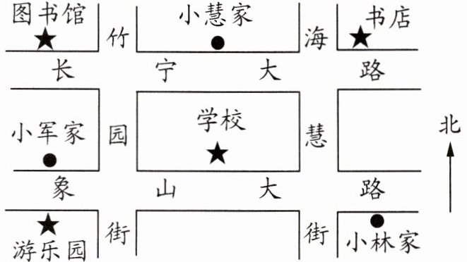 (3)学校在小慧家的( )面,小军家在小慧家的( )面。