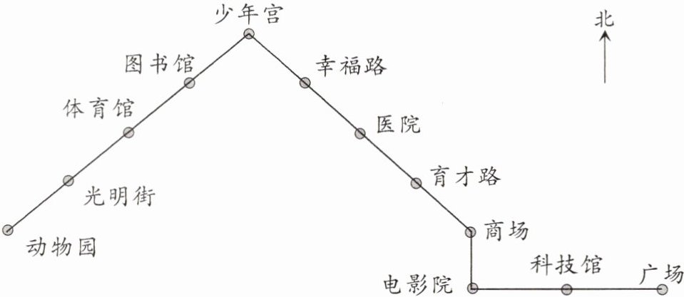 (3)19 路车从广场出发,向( )行驶到( ),再向( )行驶到( ),再向( )行驶到( ),最后向( )行驶到动物园。