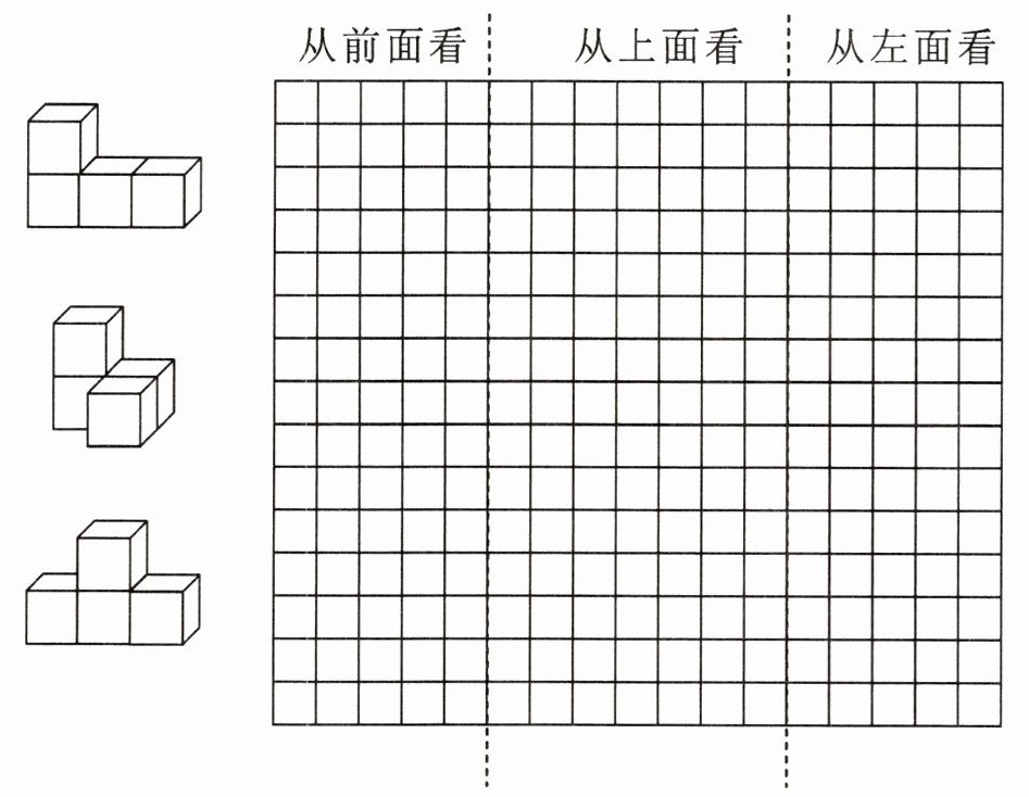 4.(★★★☆☆)画一画,在方格纸上画出从正面、左面和上面看到的图形。