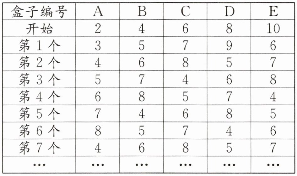 继续按照规则进行操作,可以发现从第$2$个小朋友到第$6$个小朋友给$A$、$B$、$C$、$D$、$E$五个盒子放球的结果构成一个周期,周期长度为$5$。