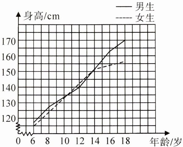 (2)18岁时,男、女生的平均身高相差最大;14岁以后,女生的平均身高增长缓慢。(答案不唯一,合理即可)