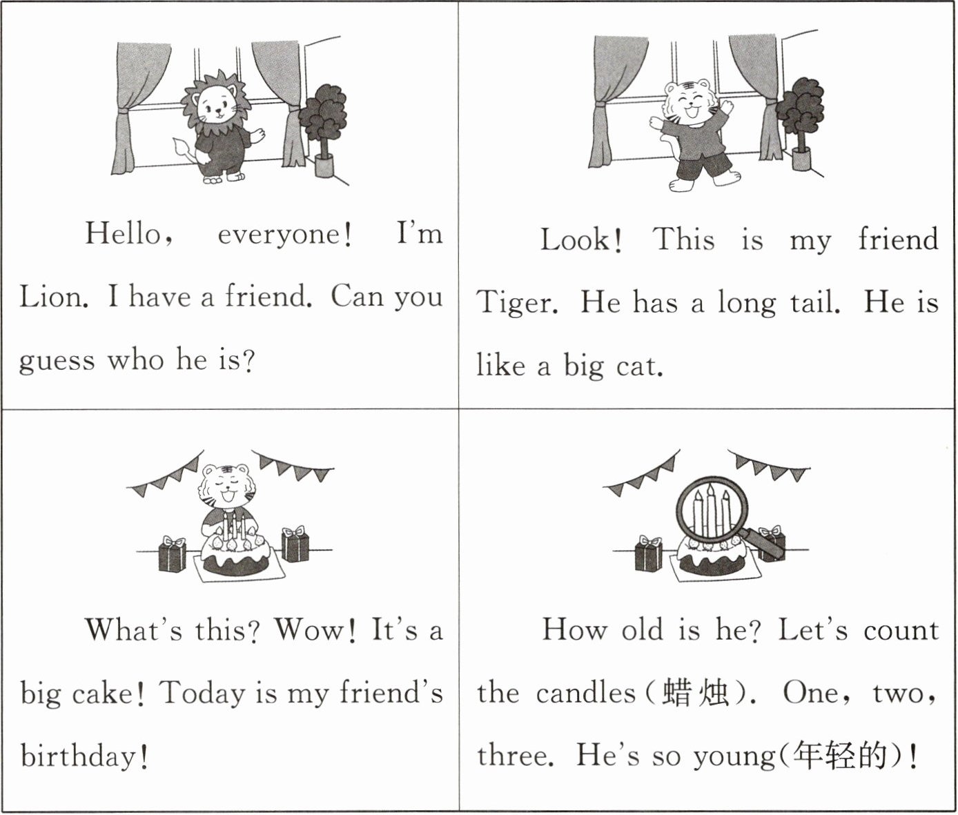 Mike扮成小狮子的模样,给伙伴们带来精彩的表演,赢得了阵阵掌声。阅读下面的内容,完成任务。