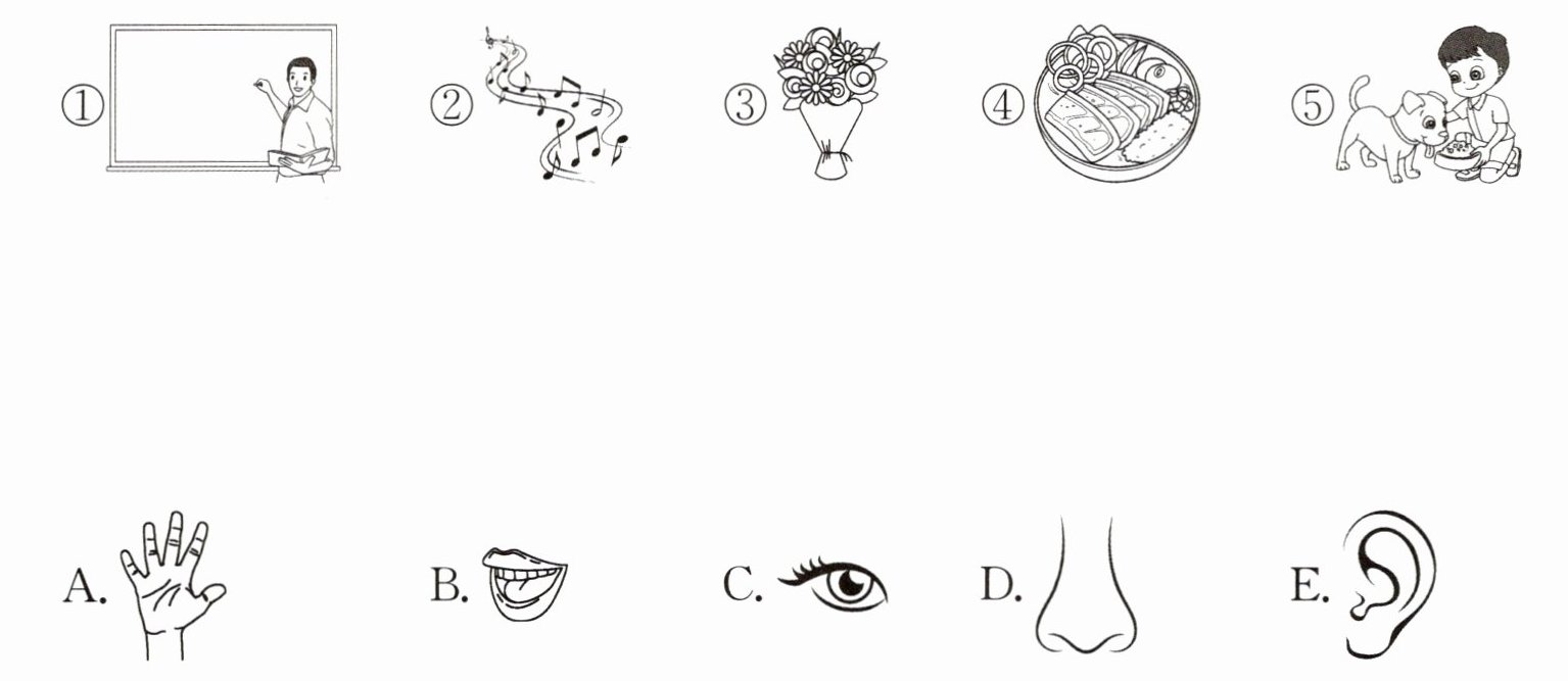 I see teachers in class with my eyes. I hear songs in the music(音乐) class with my ears. I recognize(辨别出) different smells of flowers with my nose. I taste food(食物) in the canteen(食堂) with my tongue. I touch my dog with my hand. This shows my kindness(友好).②