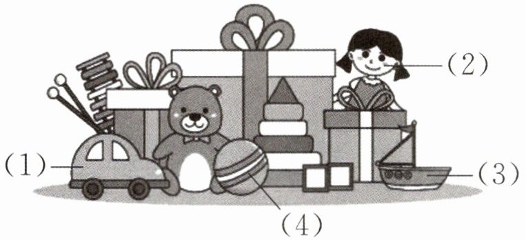 丹丹有一些玩具,请帮她给这些玩具贴上标签吧。选词填空,把答案填在横线上。