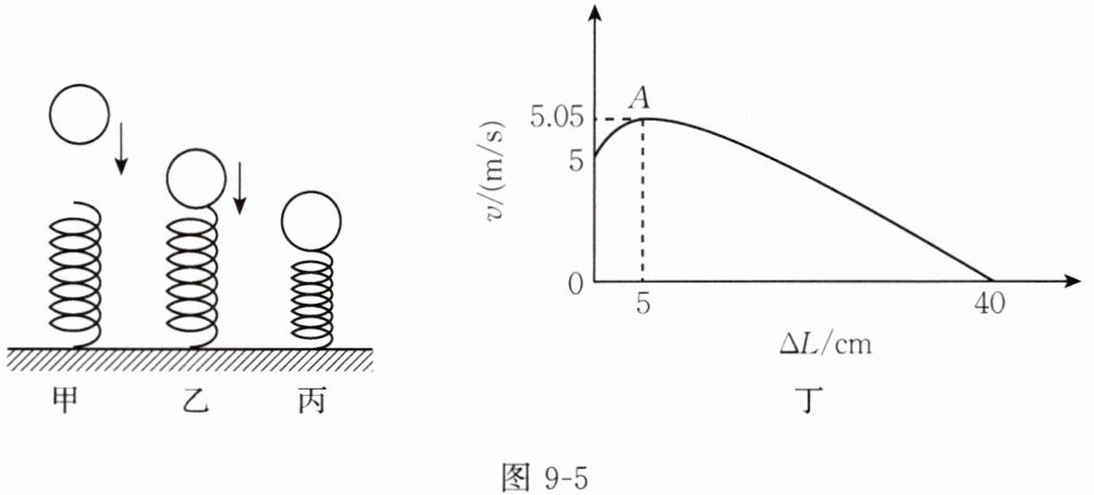 5. 小球从高处下落到竖直放置的轻弹簧上(如图9-5甲所示),在刚接触轻弹簧的瞬间(如图9-5乙所示)速度为5m/s。将弹簧压缩到最短(如图9-5丙所示)的整个过程中,小球的速度和弹簧缩短的长度ΔL之间的关系如图9-5丁所示,其中A为曲线的最高点。已知轻弹簧每受到0.5N的压力就缩短1cm,并且轻弹簧在从受到撞击到被压缩到最短的整个过程中始终发生弹性形变,g取10N/kg。下列说法正确的是(