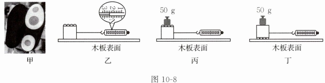 。(3)同组的小明想进一步验证小宇的结论是否正确,于是取来了 10 g、50 g 的砝码各一个,进行了如图 10 - 8 丙、丁所示的实验。当进行图丁所示的实验时,弹簧测力计的示数达到最大值时仍无法拉动木块。为了使用现有器材就能完成此实验,可尝试采用的操作方法是