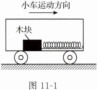 4. 如图 11-1 所示,在平直路面上向右行驶的小车中,一轻质弹簧的一端固定在车厢右壁,另一端连接于放在车厢底板(底板粗糙)上的木块,弹簧此时处于原长状态并保持水平。下列说法正确的是(