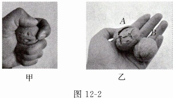 2. 如图 12 - 2 甲所示,用手握住一个核桃很难将其捏破;如图 12 - 2 乙所示,将 A、B 两个核桃放在一起用手用力捏,A 破了,B 没破。下列说法正确的是(