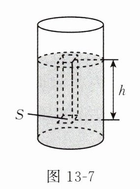 6. 同学们探究完液体的压强后,又想得到液面下某处的液体压强与液体深度和液体密度的定量关系。设想液体中有一个水平放置的“平面”,如图 13 - 7 所示,这个“平面”以上的液柱对“平面”的压力等于液柱所受的重力。设液体密度为 $\rho$,液柱的高度为 $h$,“平面”的面积为 $S$,请你用压强公式推导出液体压强的计算公式 $p = \rho gh$。
