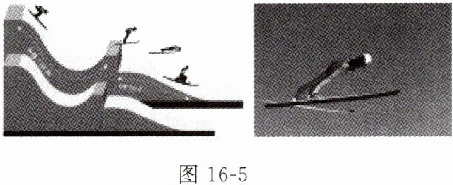 6. 跳台滑雪极具观赏性。如图 16-5 所示,滑雪过程中,运动员通过一个凹形轨道助滑后,在起跳的瞬间用力一蹬伸展身体,调整好姿势在空中飞行,运动员弯曲的身体和滑雪板构成的形状跟飞机的机翼相似,使运动员在空中获得升力,可滑行更远的距离。请用物理知识解释运动员在空中获得升力的原因。
