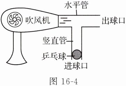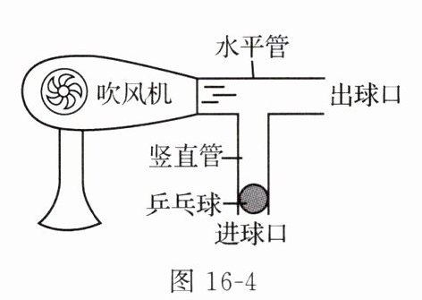 5. 图 16-4 为自制乒乓球发球机的示意图,当用吹风机向水平管吹风时,乒乓球上方的气体流速变