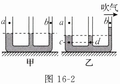 3. 如图 16-2 甲所示,连通器中的水静止,此时水面上方 a、b 处的气压分别为$p_{a0}$、$p_{b0}$。在 b 上方持续水平吹气,水面稳定后如图 16-2 乙所示,此时 a、b 处的气压分别为$p_{a}$、$p_{b}$,水面下 c、d 处水的压强分别为$p_{c}$、$p_{d}$。若大气压保持不变,则(