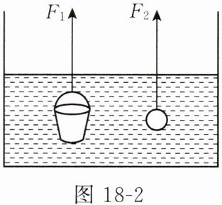 2. 将系于绳端的质量相等的无盖铁桶和实心铁球同时浸没在水中,静止在如图18-2所示的位置,绳子对它们的拉力分别为$F_{1}$、$F_{2}$,则(