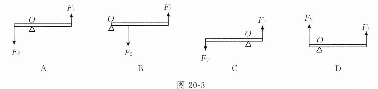3. 如图 20 - 2 所示,用起子开启瓶盖,可以将起子抽象为一个杠杆。如果不计自重,图 20 - 3 中能正确描述起子工作原理的是(