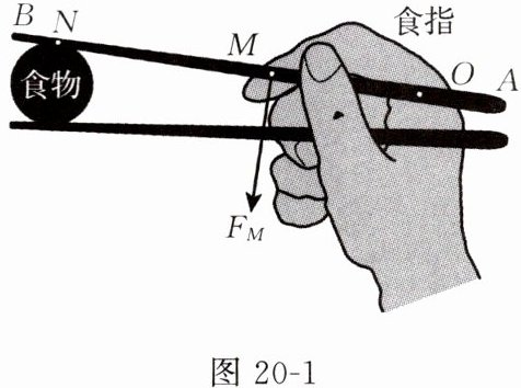 2. 【传统文化】筷子是中华饮食文化的标志之一。如图 20 - 1 所示,将其中一根筷子 AB 作为杠杆进行分析。O 点是支点,食指指头对筷子上 M 点的压力$F_{M}$(垂直于筷子)是动力,食物对筷子上 N 点的压力$F_{N}$(垂直于筷子)是阻力。动力$F_{M}$的力臂是(