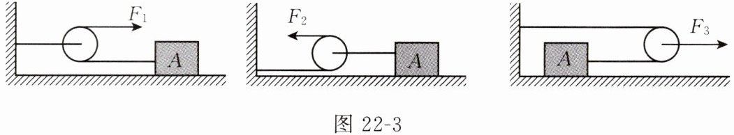 4. 如图 22-3 所示,用三种不同的方式分别拉同一物体 A 在相同的水平地面上做匀速直线运动,所用的拉力分别为 $ F_1 $、$ F_2 $ 和 $ F_3 $。不计滑轮重、绳重及摩擦。下列判断正确的是(