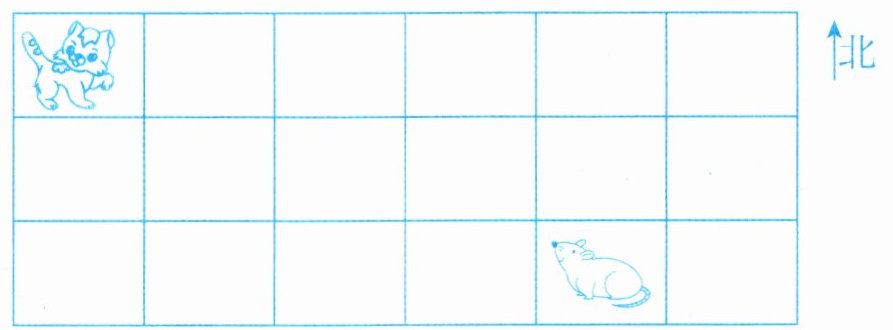 1. (由于无法直接画图,这里用文字描述位置)小猫先向南走 1 格(即向下走 1 格),再向东走 5 格(即向右走 5 格)后的位置在从原来小猫位置向下 1 格,再向右 5 格处。
