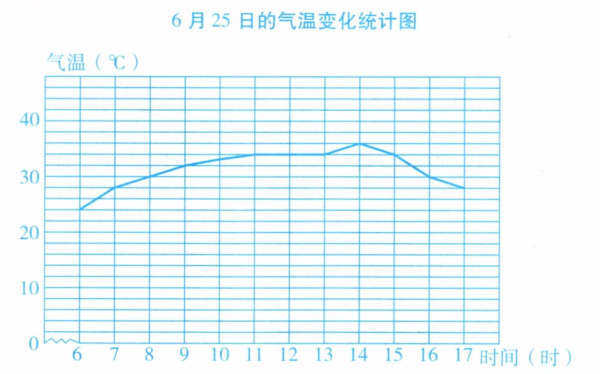 某小学气象小组的同学于 6 月 25 日这一天测量了校园的气温,他们每隔一小时测一次,并把测得的数据画成了折线统计图。请你根据折线统计图,回答下面的问题。