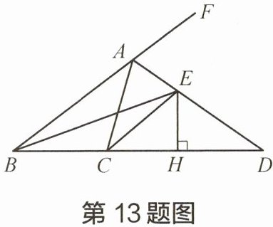 13. 如图,在△ABC 中,点 F 在射线 BA 上,点 D 在边 BC 的延长线上,∠ACB = 106°,连接 AD,∠ABC 的平分线交 AD 于点 E,过点 E 作 EH⊥BD,垂足为点 H,连接 CE,且∠CEH = 53°。