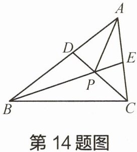 14. 如图,在△ABC 中,∠BAC = 60°,△ABC 的两条角平分线 BE 和 CD 相交于点 P,连接 AP。