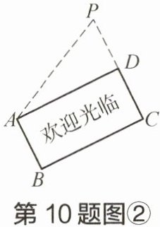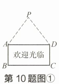 10. 如图,门上钉子 $ P $ 处挂了一个“欢迎光临”的长方形挂牌 $ ABCD $,其中 $ AB = 10 \mathrm{cm} $,$ AD = 24 \mathrm{cm} $。如图①,当挂牌水平悬挂(即 $ BC $ 与地面平行)时,测得挂绳总长为 $ 40 \mathrm{cm} $,其中 $ AP = DP = 20 \mathrm{cm} $,此时点 $ P $ 到 $ BC $ 所在直线的距离为______$ \mathrm{cm} $。将挂绳的总长度缩短 $ 4 \mathrm{cm} $ 后重新挂上,此时不小心把挂牌弄斜了(如图②),发现此时 $ AC $ 与地面平行,且点 $ P $、$ D $、$ C $ 三点在同一直线上,则点 $ B $ 的高度下降了______$ \mathrm{cm} $。