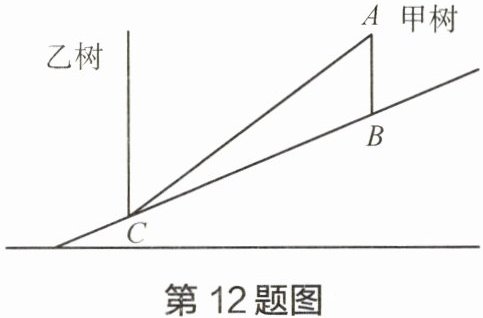 12. 由于大风,山坡上的一棵树(甲树)被拦腰折断,如图,折断处为点 $ A $,其树顶端恰好落在另一棵树乙的根部 $ C $ 处。已知 $ AB = 4 $ 米,$ BC = 13 $ 米,两棵树的水平距离为 $ 12 $ 米,求这棵树原来的高度。