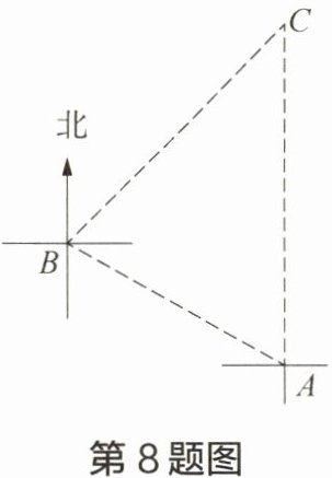 8. 如图,国庆节期间,小明一家自驾到某景区 $ C $ 游玩,到达 $ A $ 地后,导航显示车辆应先行驶 $ 10 $ 千米至 $ B $ 地,再沿北偏东 $ 45 ^ { \circ } $ 方向行驶 $ 8 \sqrt { 2 } $ 千米到达景区 $ C $。小明发现景区 $ C $ 恰好在 $ A $ 地的正北方向,则 $ A $、$ C $ 两地的距离为______千米。