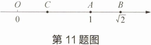 11 如图,数轴的正半轴上有 $ A $、$ B $、$ C $ 三点,点 $ A $、$ B $ 分别表示 $ 1 $ 和 $ \sqrt { 2 } $,点 $ B $ 到点 $ A $ 的距离与点 $ C $ 到点 $ O $ 的距离相等,设 $ C $ 所表示的数为 $ x $。