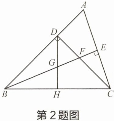 2 如图,在△ABC 中,∠ABC = 45°,BE 平分∠ABC,BE ⊥ AC 于点 E,CD ⊥ AB 于点 D,H 是 BC 边的中点,连接 DH 与 BE 相交于点 G,BE 与 CD 交于点 F。有下列结论:①AE = $\frac{1}{2}$BF;②∠A = 67.5°;③△DGF 是等腰三角形;④$S_{四边形ADGE}= S_{四边形GHCE}$。其中正确的是( )。