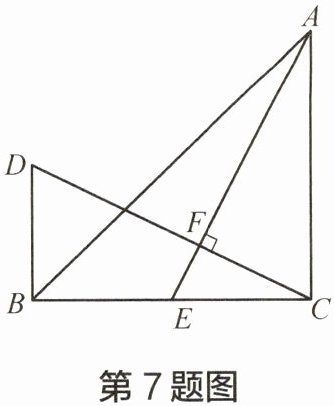 7 如图,在△ABC 中,∠ACB = 90°,AC = BC,AE 是 BC 边上的中线,CF ⊥ AE,垂足为点 F,BD ⊥ BC 交 CF 的延长线于点 D。若 AC = 10 cm,则 BD = ______cm。