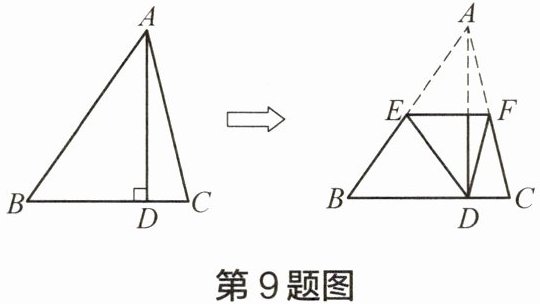 9 在△ABC 中,AB = 12,AC = 10,BC = 9,AD 是 BC 边上的高。将△ABC 按如图所示的方式折叠,使点 A 与点 D 重合,折痕为 EF,则 DE = ______,DF = ______。
