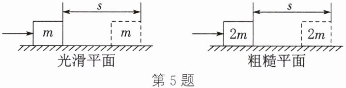 5. (连云港中考)如图所示,一个人先后两次用同样的时间、同样大小的力,将不同质量的物体在不同的表面上分别移动相同的距离。该力在此过程中所做功的大小分别为$W_{1}$、$W_{2}$,功率的大小分别为$P_{1}$、$P_{2}$,关于它们之间的大小关系说法正确的是 (