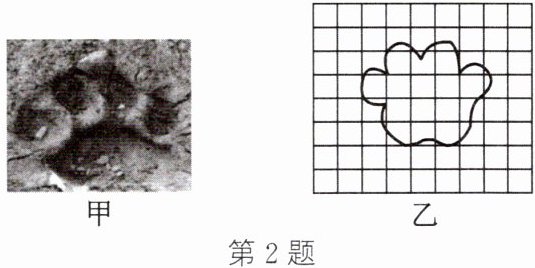 2. (北京中考)近年来人们在东北林区发现了越来越多野生东北虎的足迹。生物学家为了估算某只野生东北虎的质量,在松软、平坦且足够深的雪地上,选取该东北虎四脚着地停留时的脚印,其中的一个脚印如图甲所示。在方格纸上描绘出脚印的轮廓,如图乙所示,图中每个小方格的面积均为$9cm^2,$数出脚印轮廓所围小方格的个数(凡大于半格的都算一格,小于半格的都不算),用数出的小方格的个数乘以一个小方格的面积,就大致得出了脚印的面积。测出脚印的深度,在脚印旁边相同的雪地上放一底面积为$100cm^2$的平底容器,在容器中缓缓放入适当的物体,当容器下陷的深度与脚印的深度相同时,测出容器及内部物体的总质量为30kg。忽略脚趾和脚掌之间空隙的面积,g取10N/kg,求: