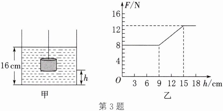3. (淄博中考)如图甲所示,水平放置的长方体容器中水深16cm,用细线将沉在容器底的圆柱体物块竖直向上匀速提升。从物块刚刚离开容器底到拉出水面的过程中,拉力F与物块下表面到容器底的距离h的关系如图乙所示。细线的质量、体积及物块带走的水均忽略不计,ρ水$= 1.0×10^3kg/m^3,g$取10N/kg。求: