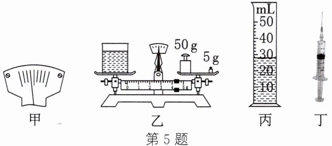 ,于是他在第(3)步中,不再利用量筒测体积,而是改用针筒(如图丁所示)从烧杯中抽取 5 mL 酸奶,再测量出烧杯和剩余酸奶的总质量,就能计算出酸奶的密度。不过细心的小刘在实验中发现 5 mL 针筒刻度线前的尖端还是有一点小“空隙”,这会导致测得的酸奶密度比实际值大