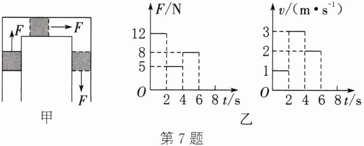7. 如图甲所示,利用拉力F将木块从一个弯折的管道左端拉进,右端拉出。已知竖直管道对木块的挤压作用完全相同,并测得拉动全过程中拉力和木块移动速度随时间变化的图像如图乙所示。则下列说法正确的是(